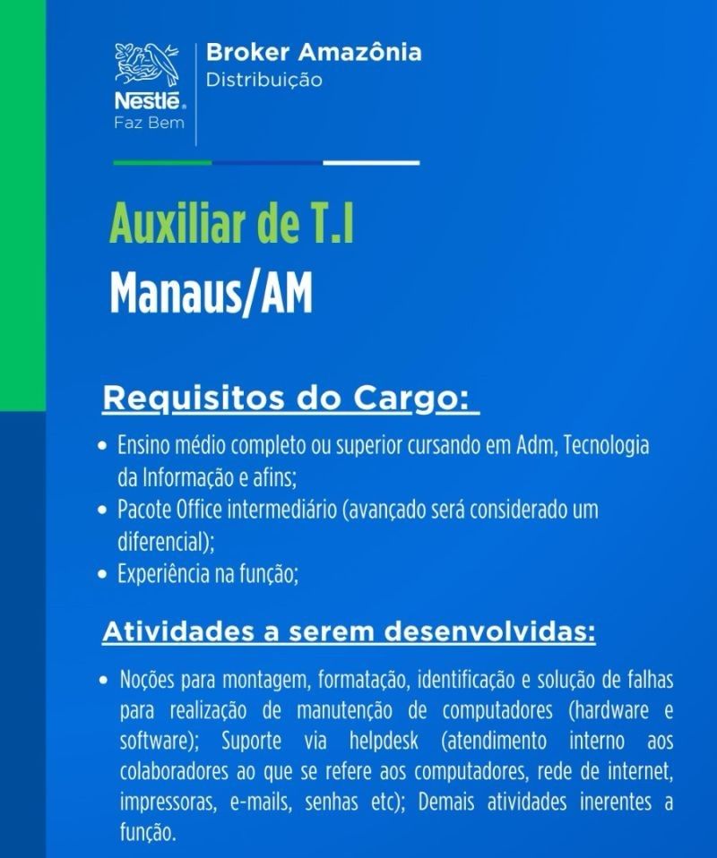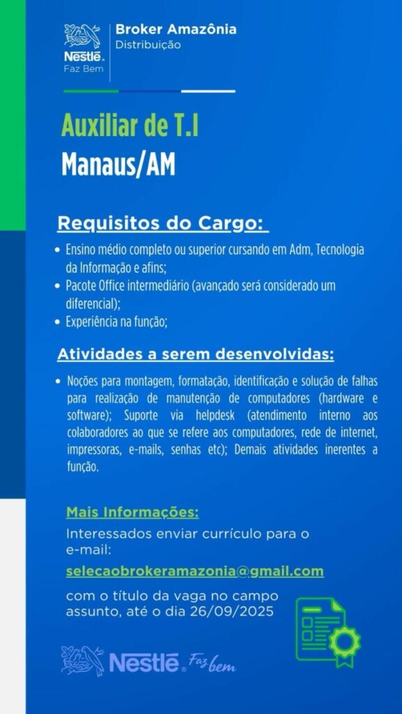 Broker da Amazônia está selecionando Auxiliar de TI; Envie seu currículo!