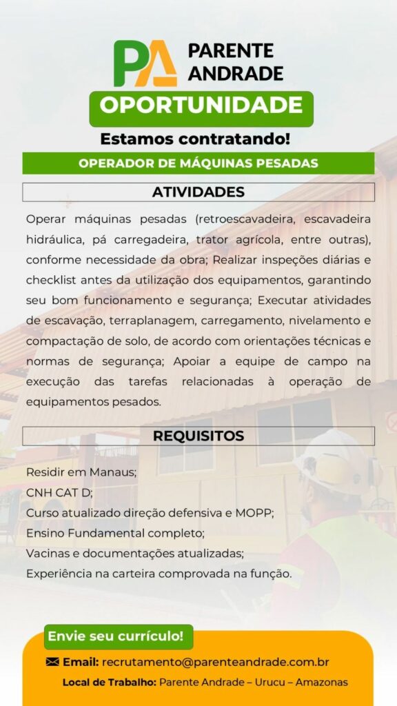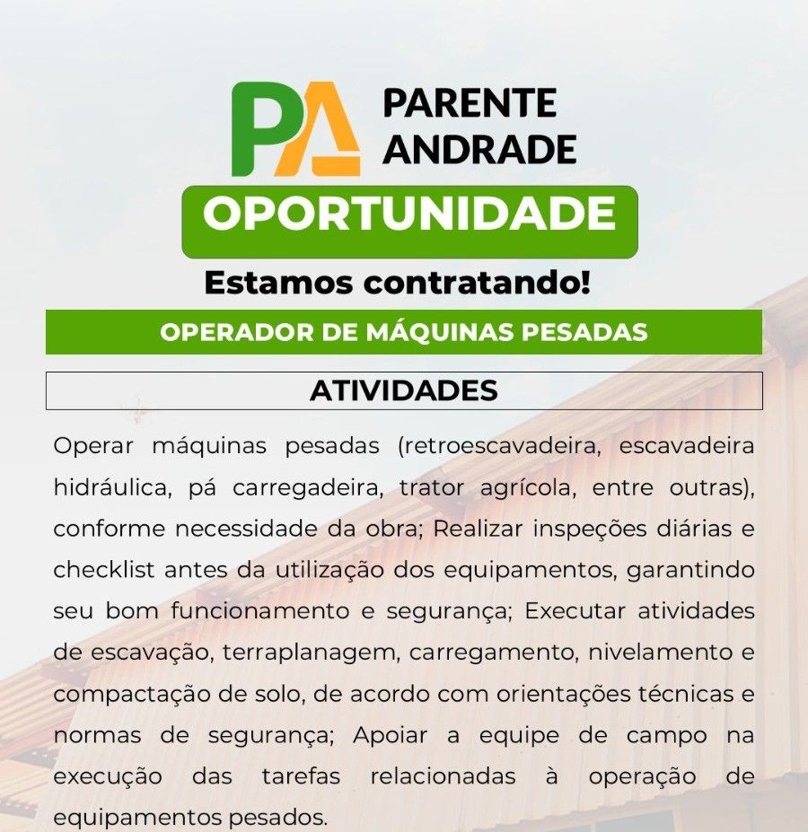 Empresa Parente Andrade está selecionando Operador de máquinas pesadas; Envie seu currículo!