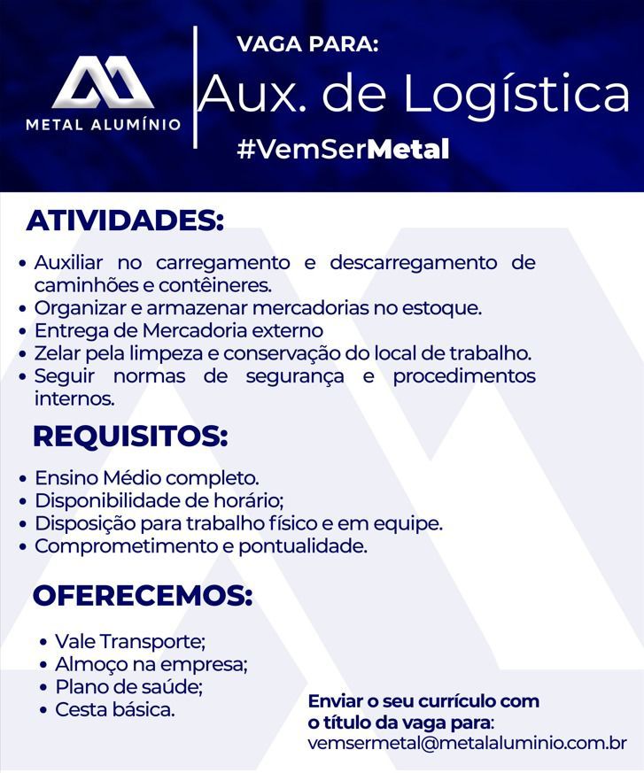 Metal Alumínio está selecionando Auxiliar de logística; Envie seu currículo!