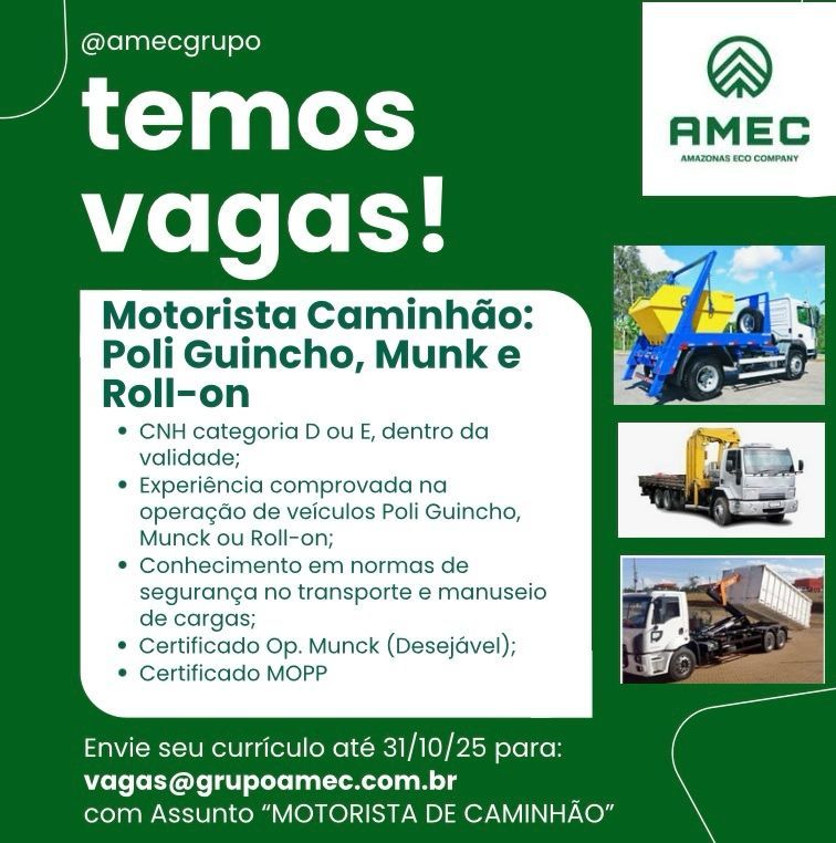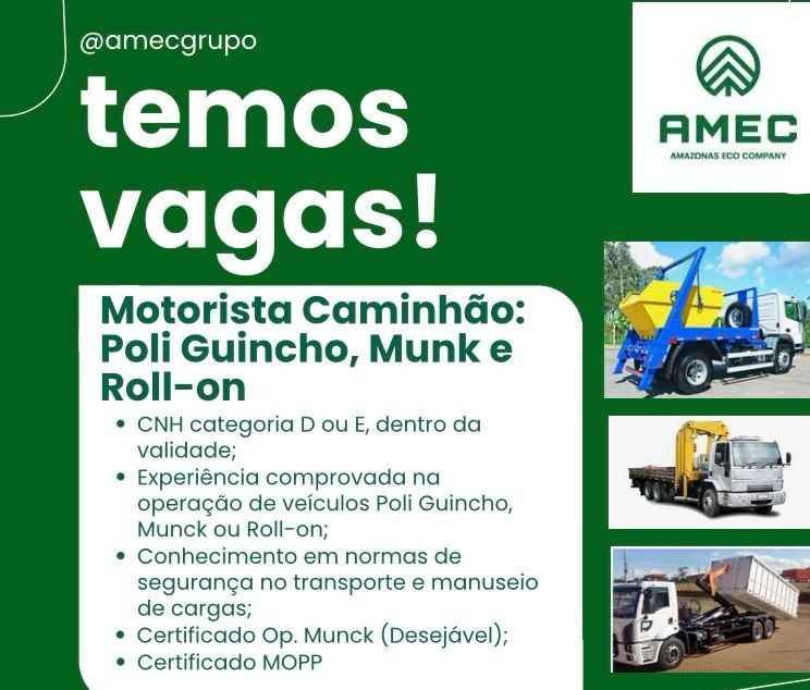 Amec está selecionando Motorista caminhão poli guincho, Munk e Rollon; Envie seu currículo!