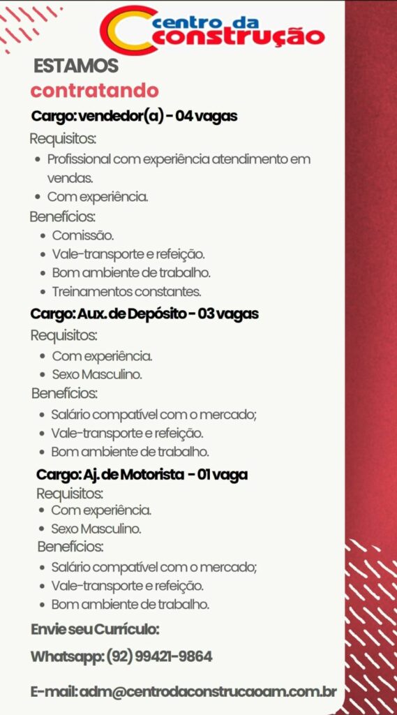 Centro da construção está selecionando Vendedor (a), Auxiliar de depósito, Ajudante de Motorista; Envie seu currículo!