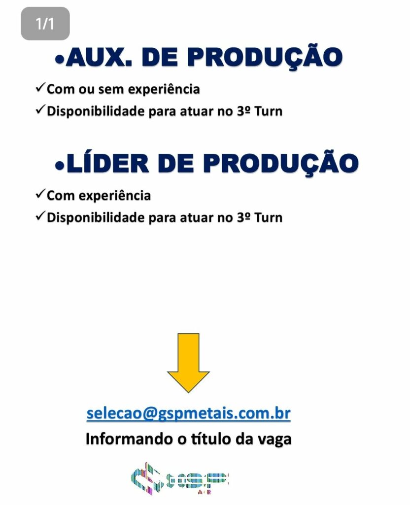 Com ou sem experiência! Empresa GSP metais está selecionando Auxiliar de produção, Líder de Produção; Envie seu currículo!
