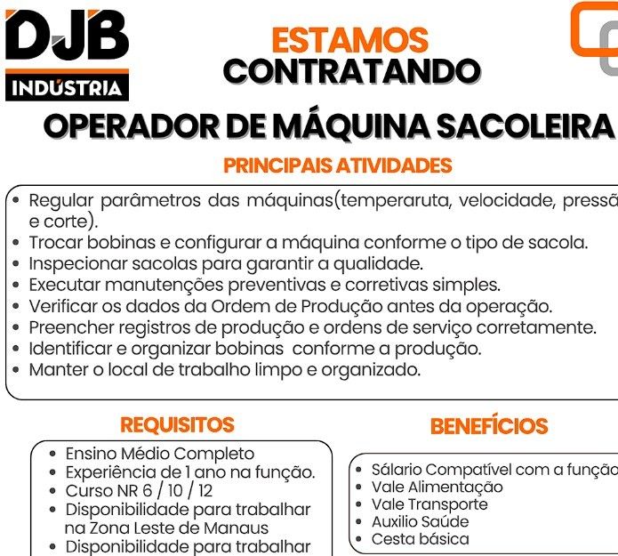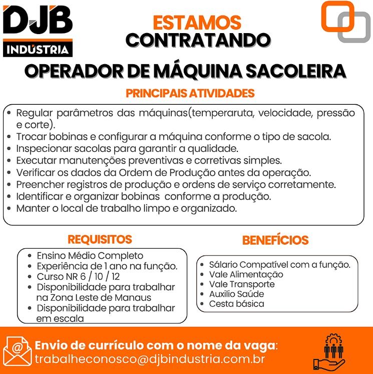 DJB Indústria está selecionando Operador de máquina sacoleira; Envie seu currículo!