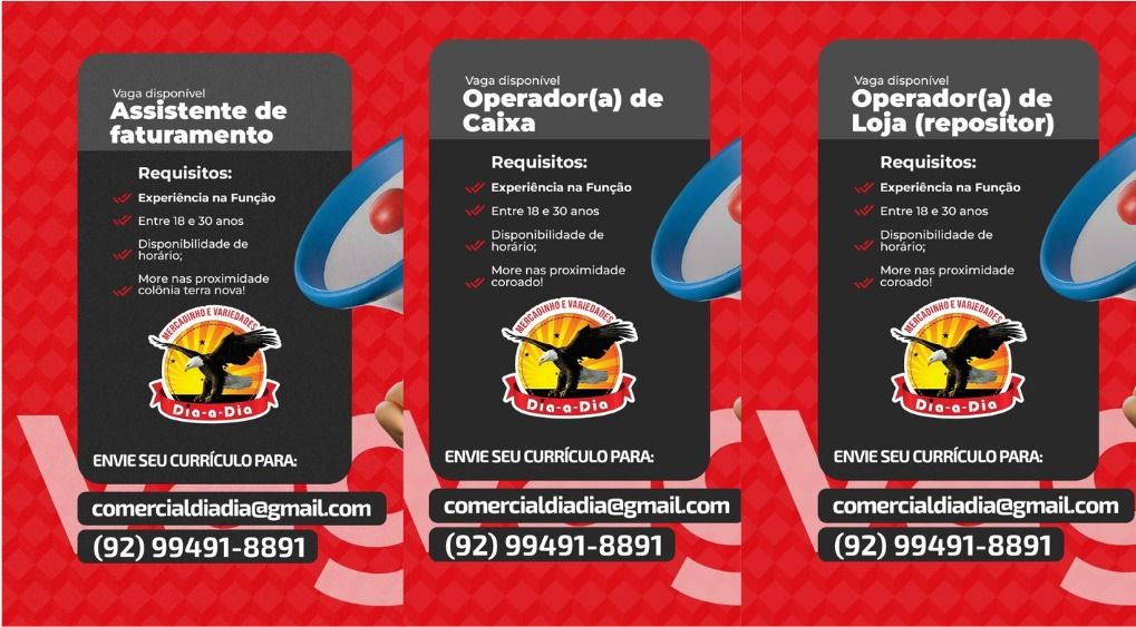 Empresa está selecionando Assistente de Faturamento, Operador (a) de caixa, Operador (a) de Loja (Repositor); Envie seu currículo!