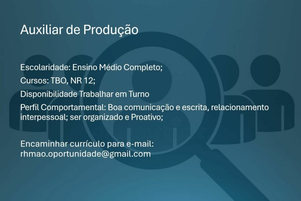 Empresa seleciona para vaga de Auxiliar de produção; Envie seu currículo!