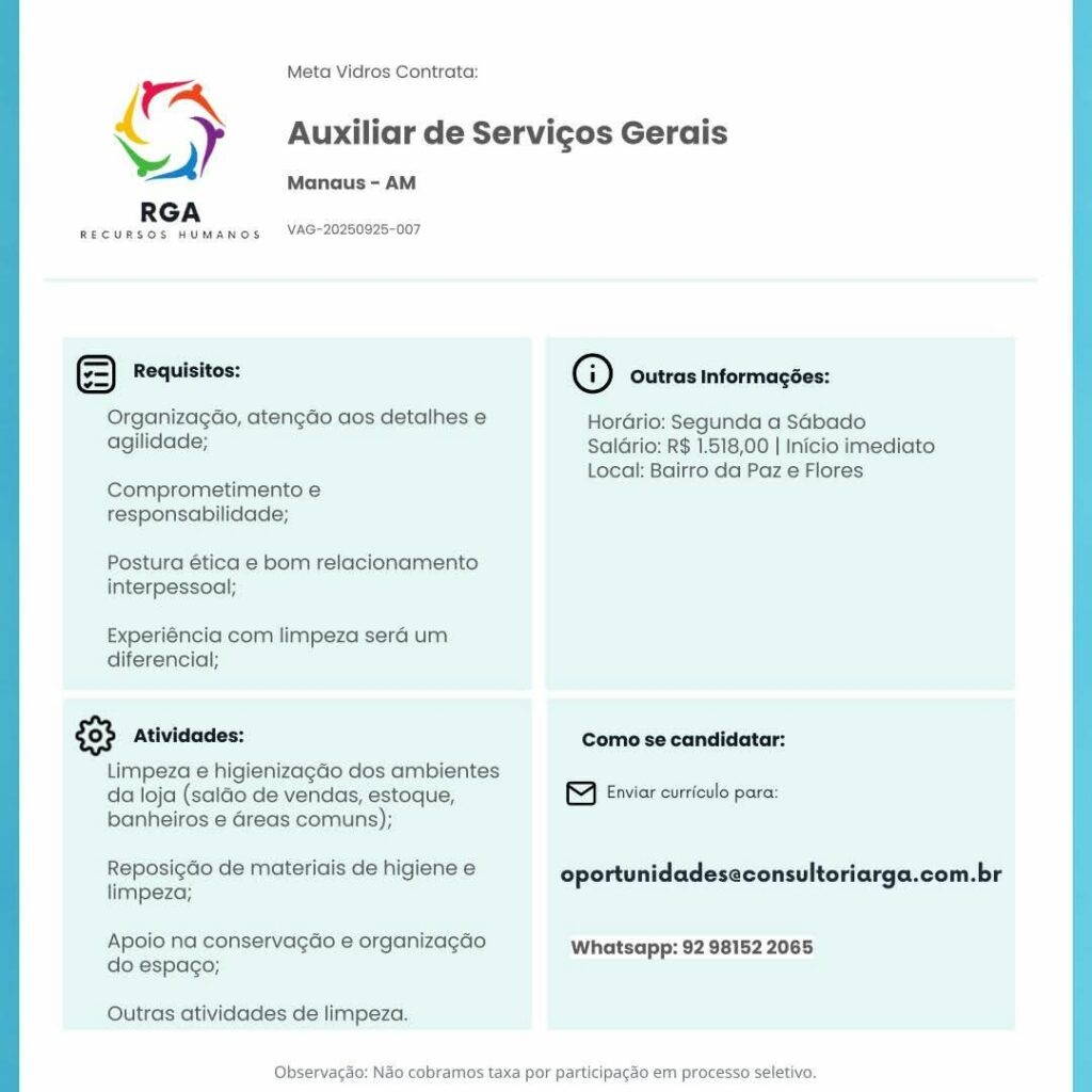 O processo seletivo para esta(s) vaga(s) não cobra absolutamente nada pela sua candidatura. Portanto, jamais aceite qualquer tipo de cobrança para cadastrar seu currículo.