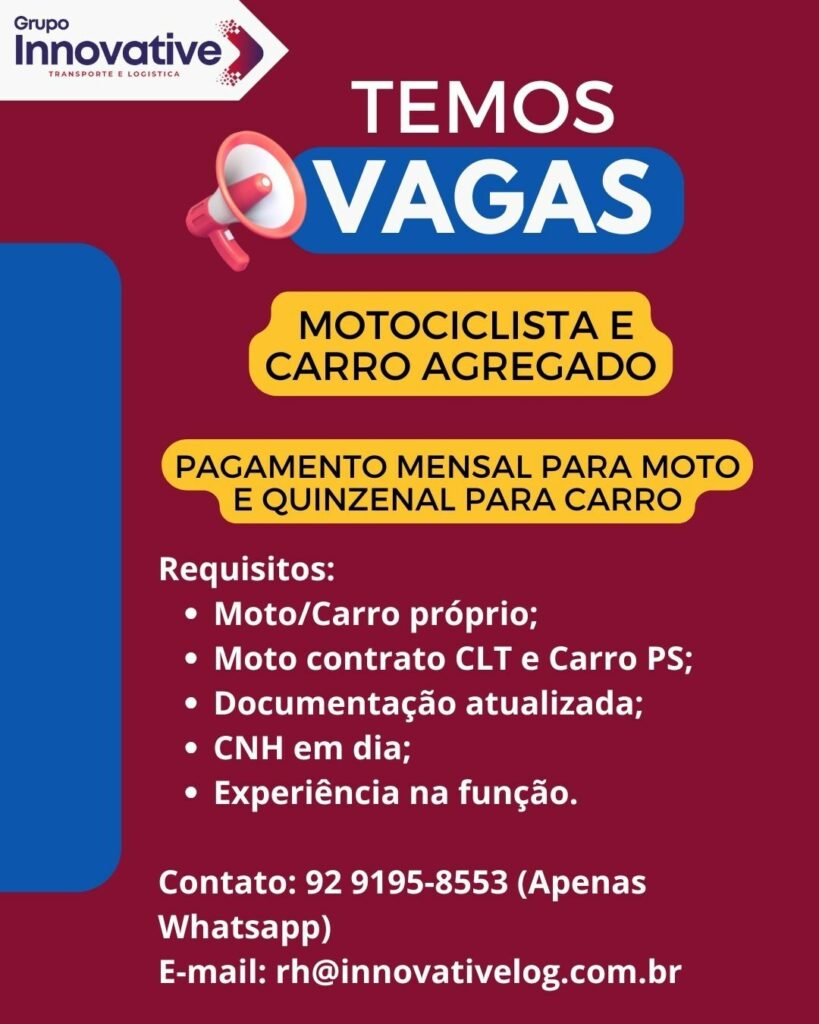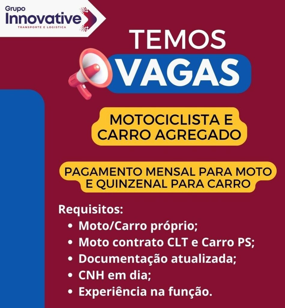 Empresa está selecionando Motociclista e carro agregado; Envie seu currículo!