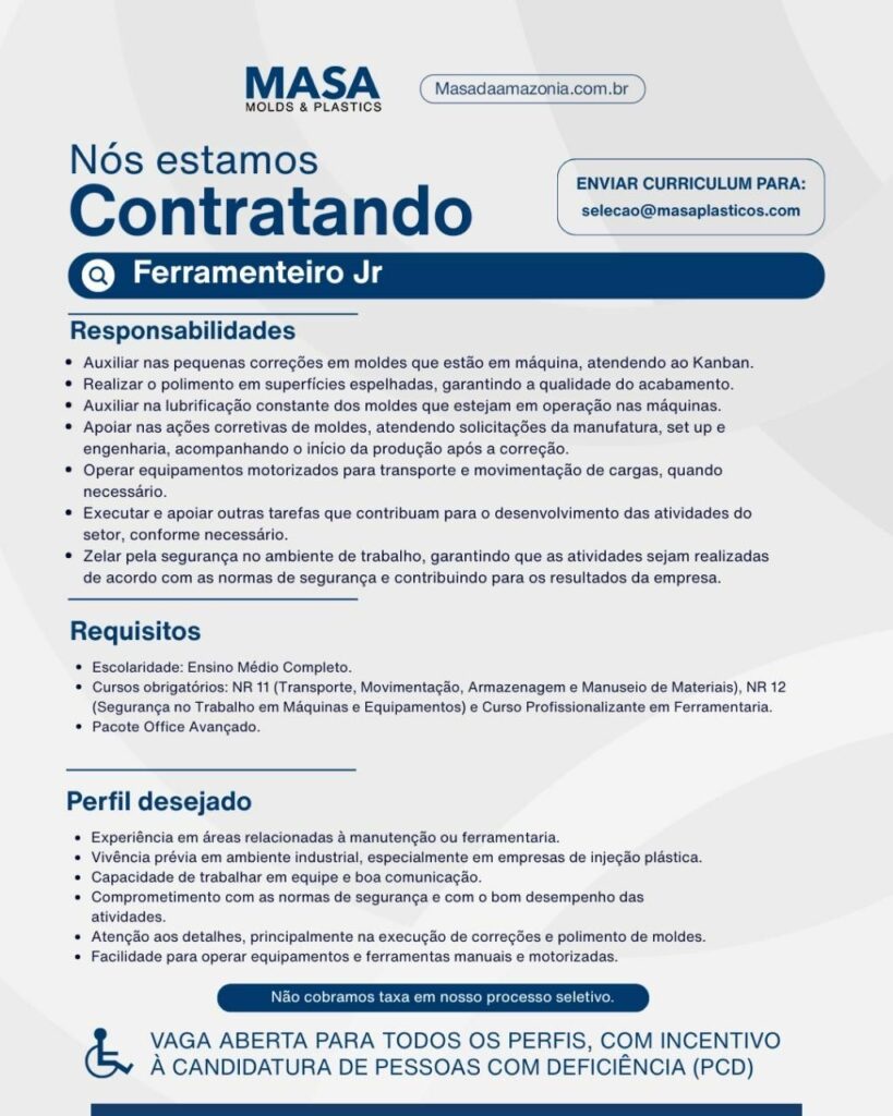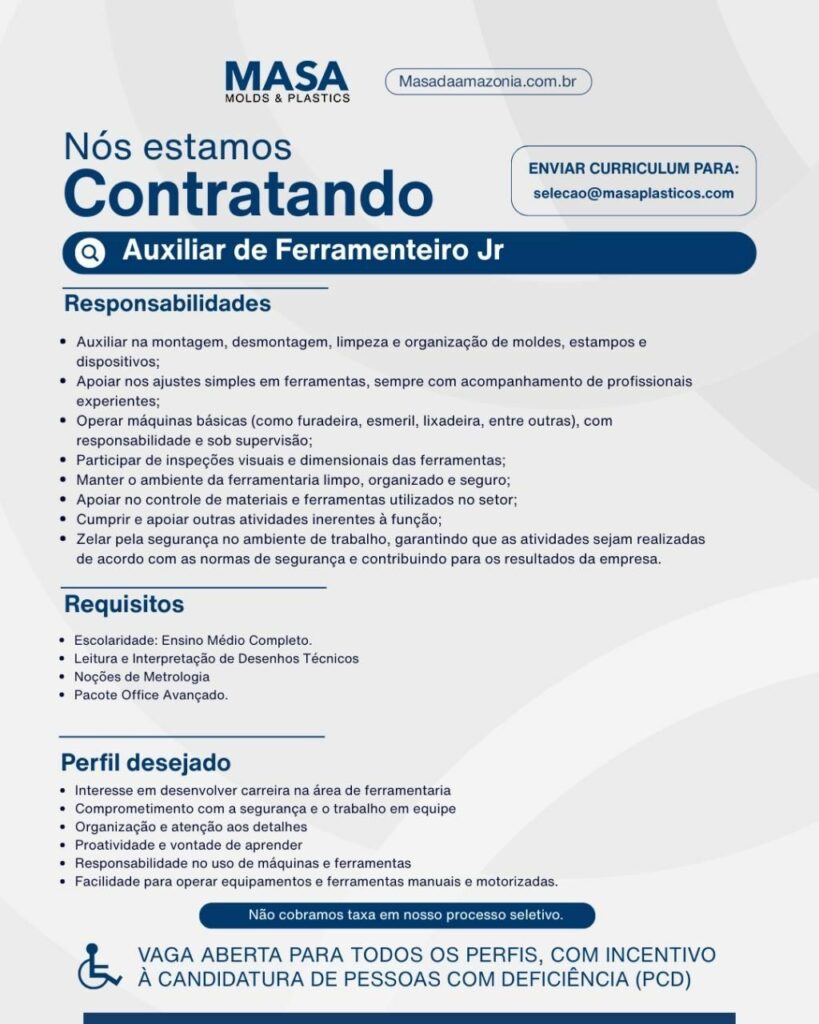 O processo seletivo para esta(s) vaga(s) não cobra absolutamente nada pela sua candidatura. Portanto, jamais aceite qualquer tipo de cobrança para cadastrar seu currículo.