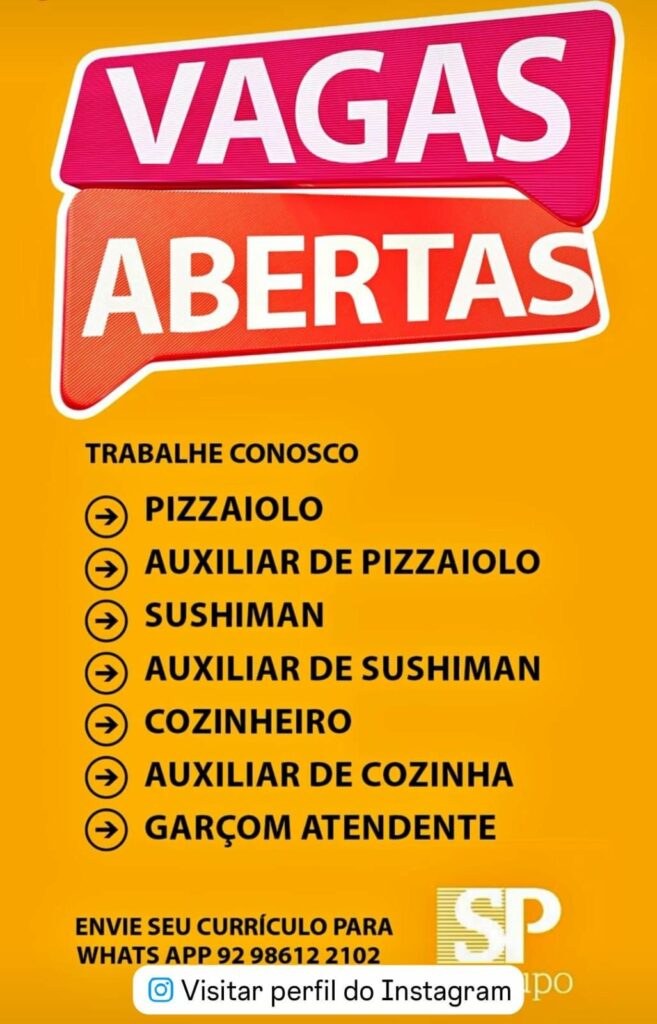 Seleção para seguintes vagas Pizzaiolo, Auxiliar de pizzaiolo, Sushiman, Auxiliar de Sushiman, Cozinheiro, Auxiliar de cozinha, Garçom Atendente; Envie seu currículo!