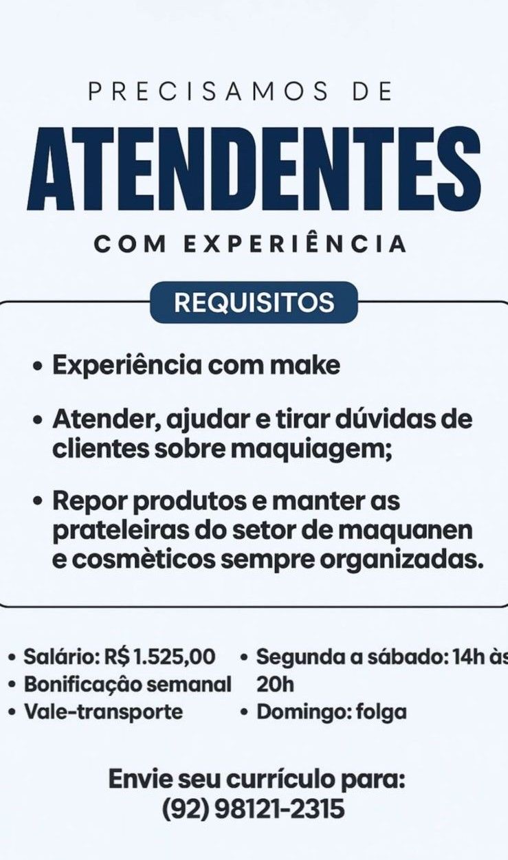 Empresa está selecionando Atendentes; Envie seu currículo!