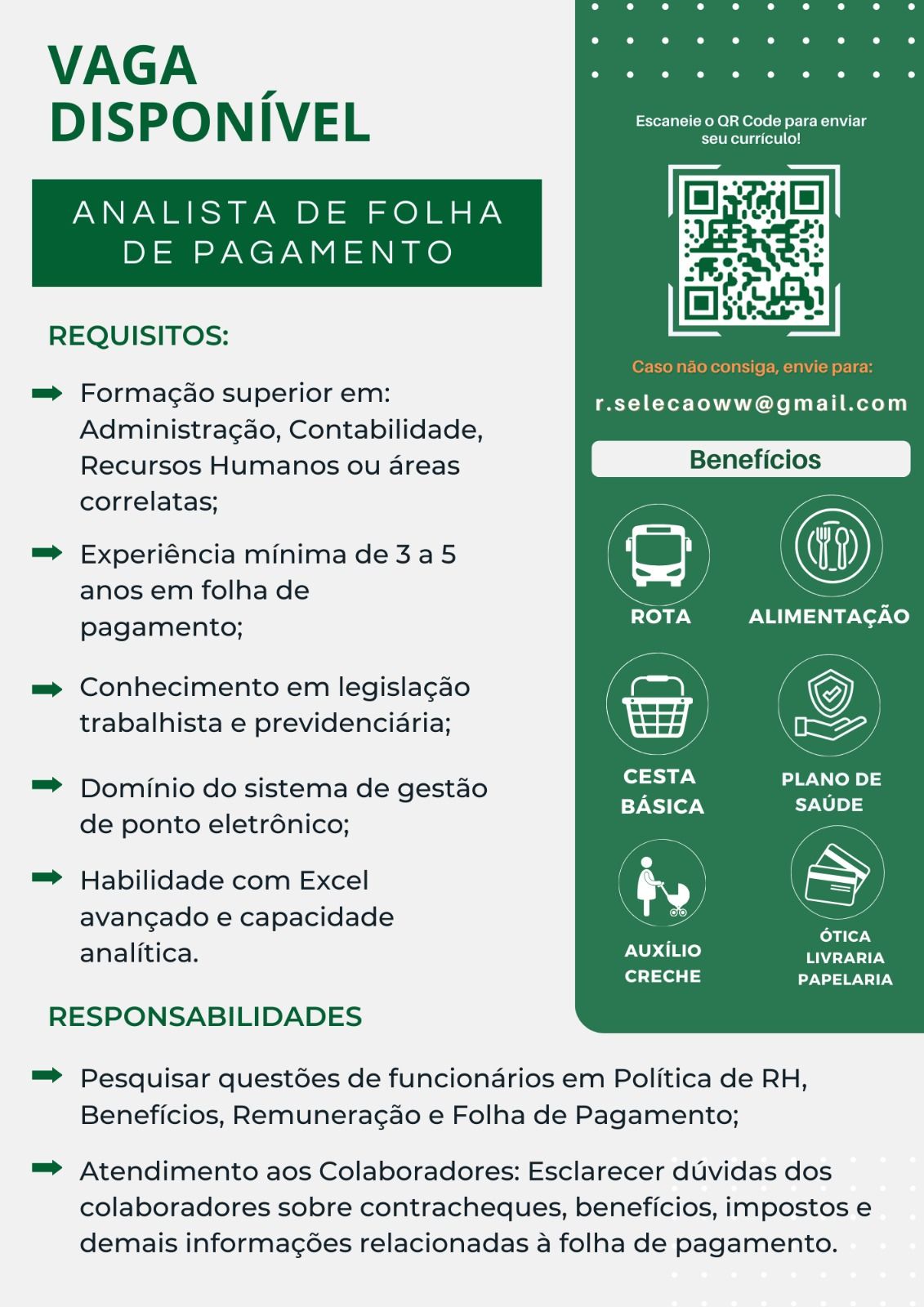 Empresa está selecionando Analista de folha de pagamento; Envie seu currículo!
