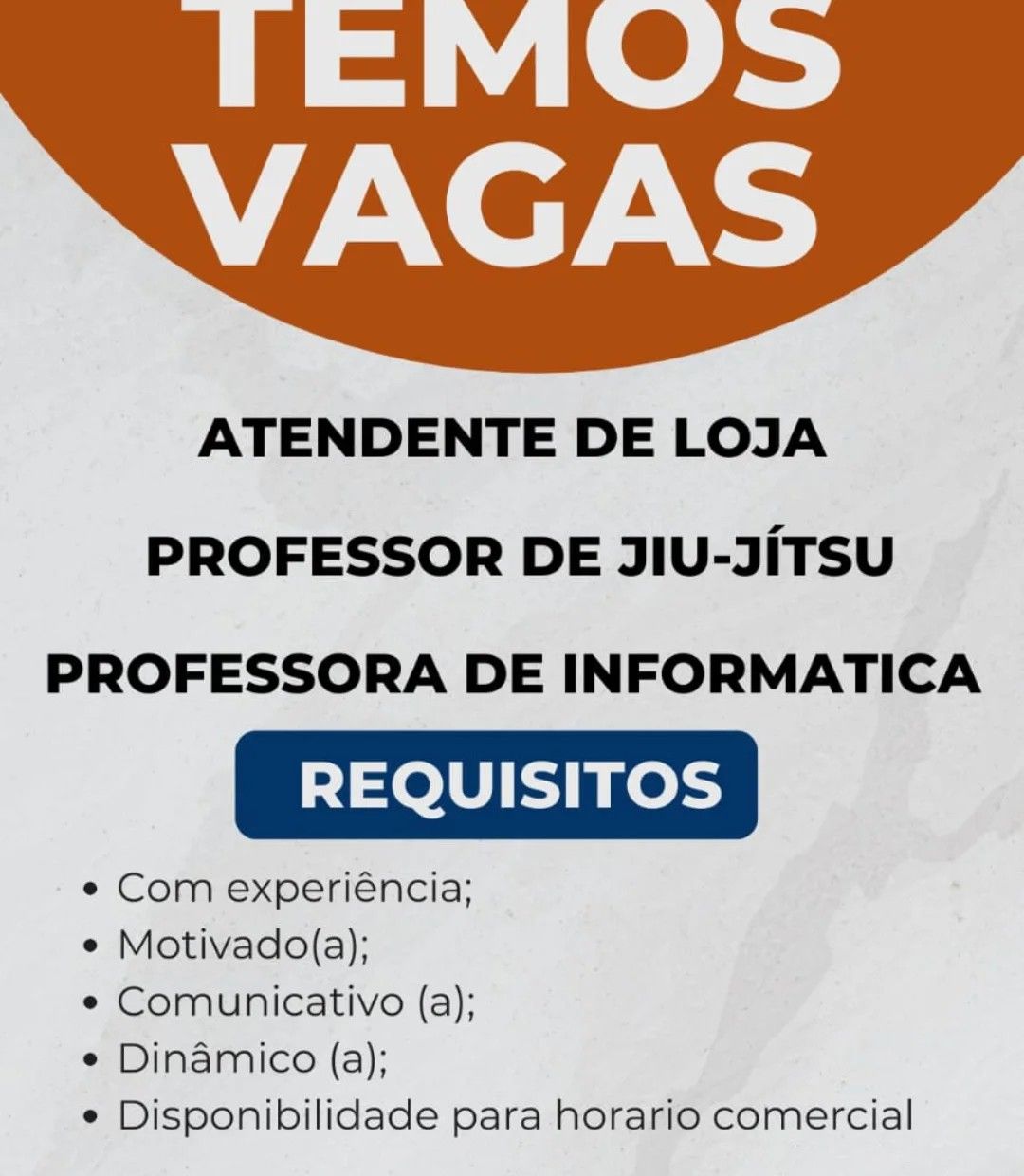 Seleção para seguintes vagas Atendente de loja, Professor de jiu-jitsu, Professora de informática; Envie seu currículo!