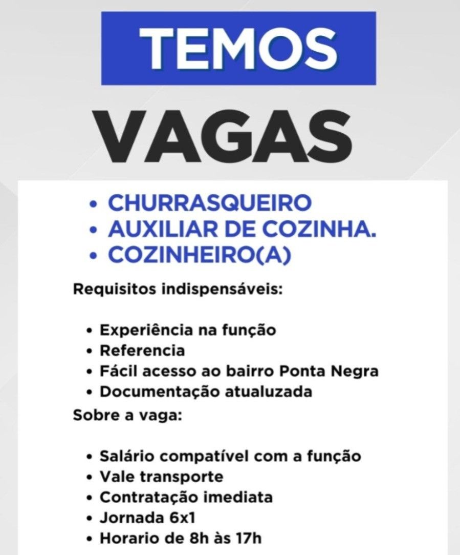 Está procurando uma vaga de emprego, mesmo sendo empregado procura um novo emprego? Ou está desempregado e não está obtendo Resultados? Fique sabendo que para ambos os casos é preciso realizar uma avaliação pessoal de… Empresa está selecionando Churrasqueiro, Auxiliar de cozinha, Cozinheiro (a); Envie seu currículo!